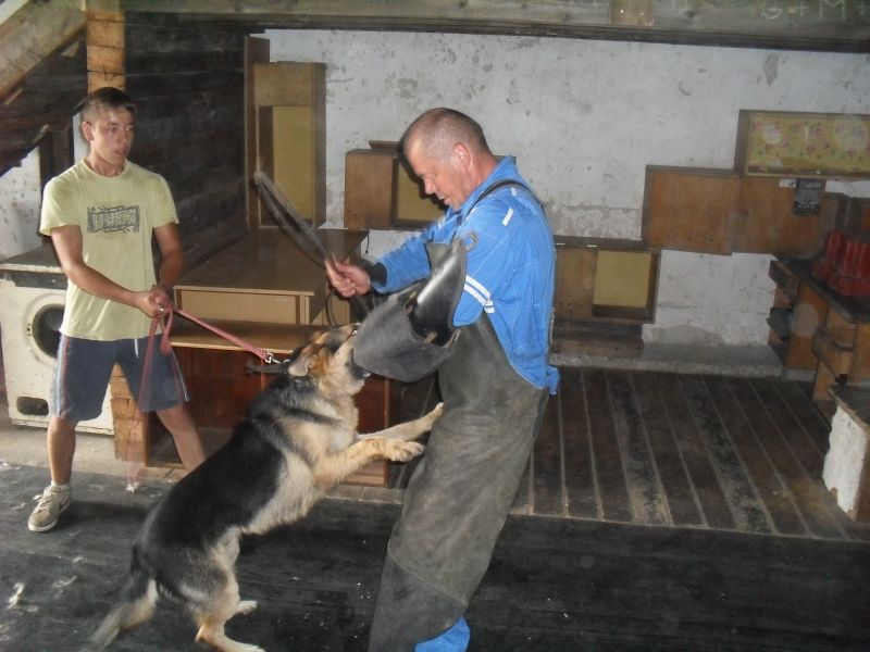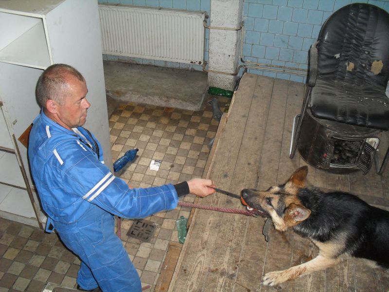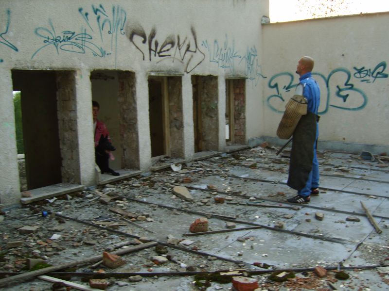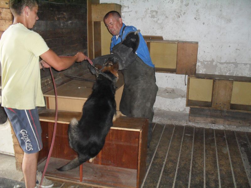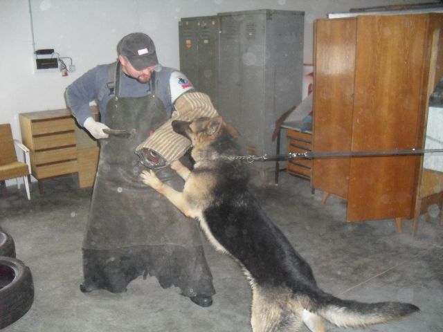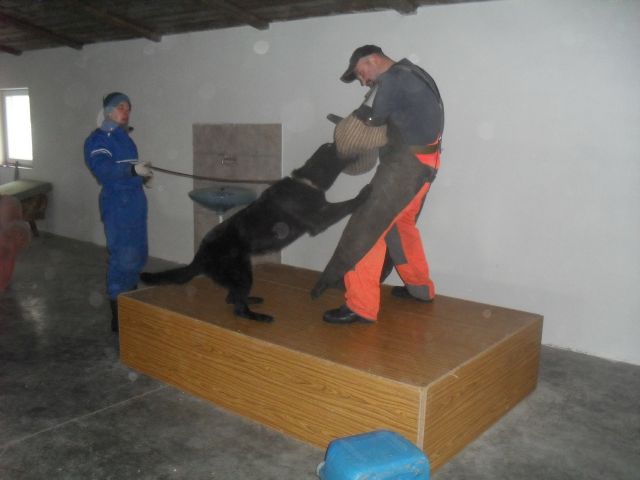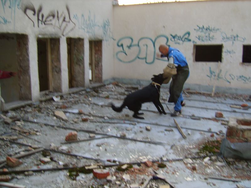 We do this test moslty in building places (old buildings, factories, abandoned hotel, our own training place) where we can simulate all possible things which a dog can encounter with. Dog has to show courage to attack an intruder without hesitation. We test dogs with or without helper (dog can be tied up to something, or let loose inside a building). Dog has to stand the ground a defend him or the handler. Dogs has also be able to find a hidden prey in boxes, cupboards etc. He has to be able to reach for prey if its on a high place. He cannot hesitate to jump over something for a bite or not to back off from a bite when something unexpected happens (weird noises, something fall on the ground etc.)