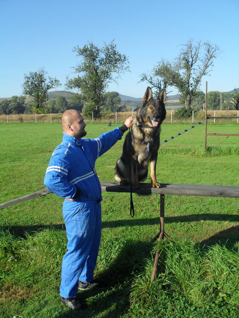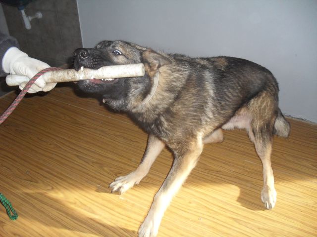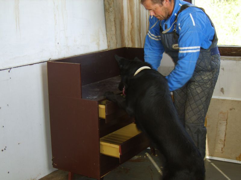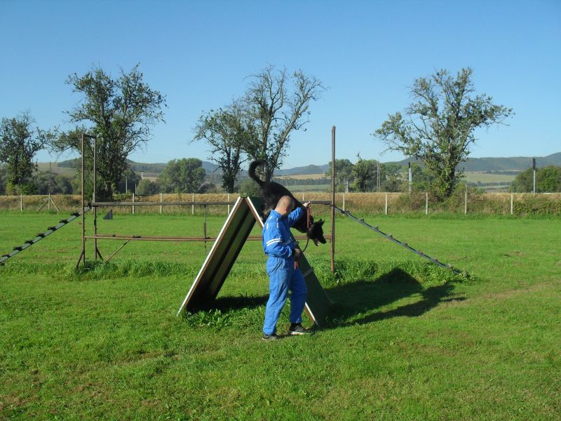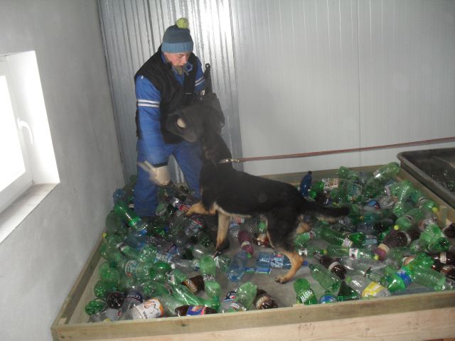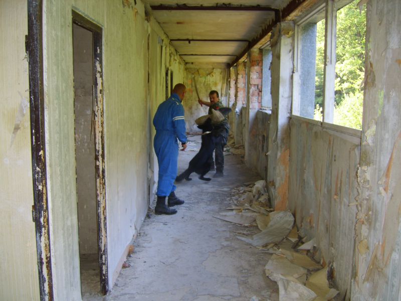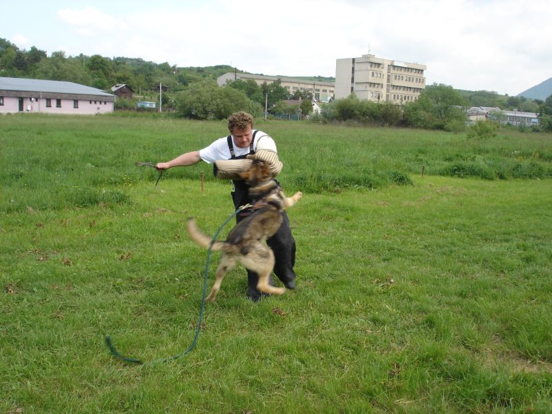 We do this test moslty in building places (old buildings, factories, abandoned hotel, our own training place) where we can simulate all possible things which a dog can encounter with. Dog has to show courage to attack an intruder without hesitation. We test dogs with or without helper (dog can be tied up to something, or let loose inside a building). Dog has to stand the ground a defend him or the handler. Dogs has also be able to find a hidden prey in boxes, cupboards etc. He has to be able to reach for prey if its on a high place. He cannot hesitate to jump over something for a bite or not to back off from a bite when something unexpected happens (weird noises, something fall on the ground etc.)