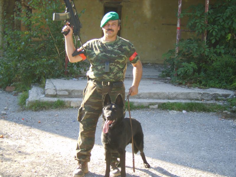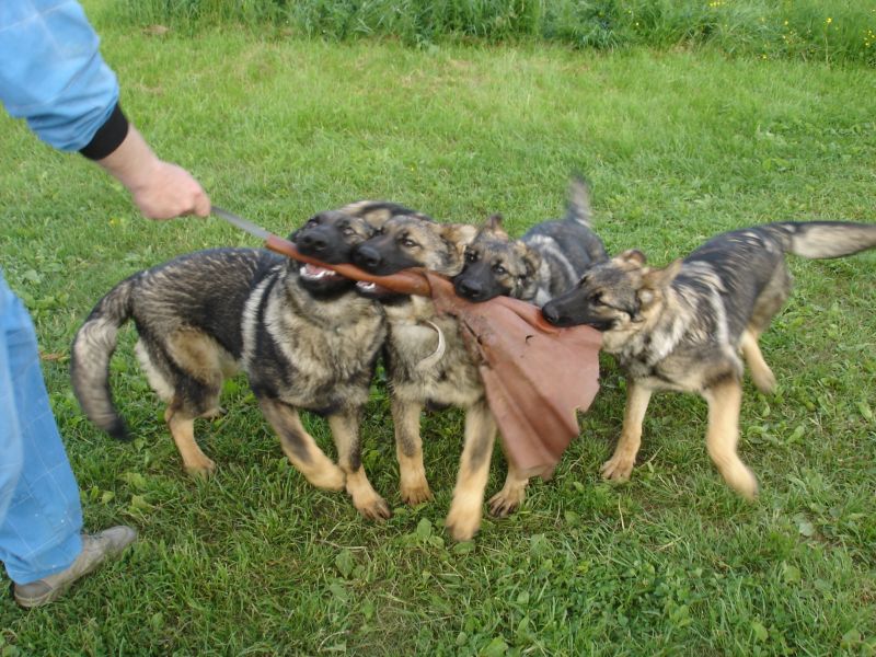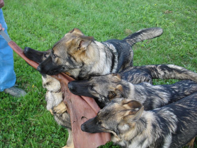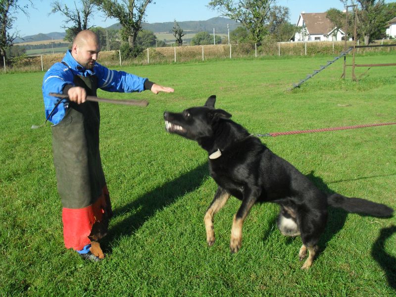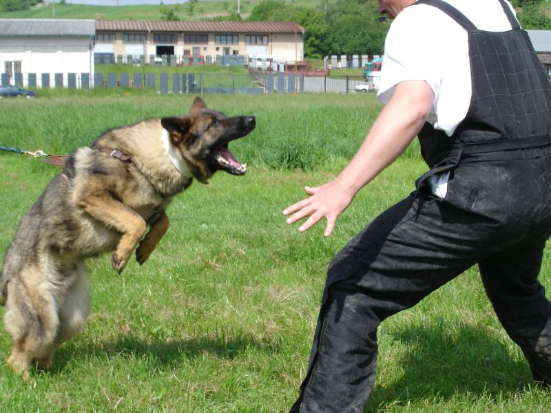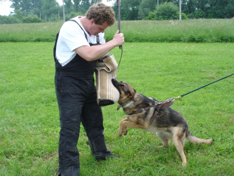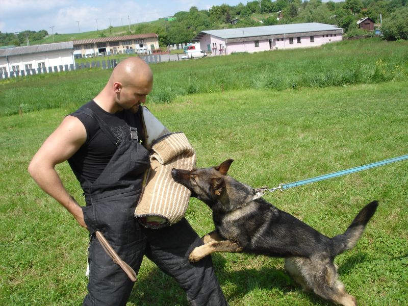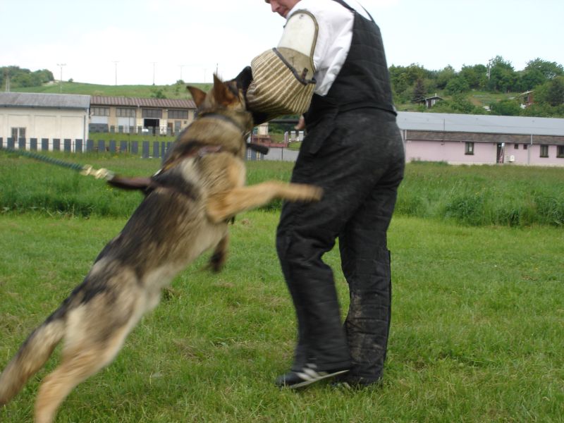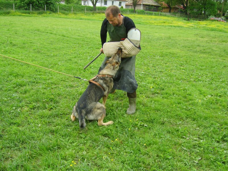 This test includes a bite with or without handler, long distance bite, defense while tied on a pole or defending a handler. Every dog has to defend his teritory without a handler. To test a resistance of a gunshot is a must.